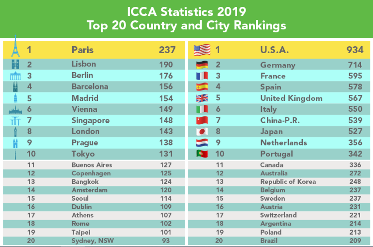 A Associação Internacional de Congressos e Convenções (ICCA) anunciou os resultados do Relatório de 2019, onde foi apresentado o ranking das 20 cidades e países com mais conferências internacionais.